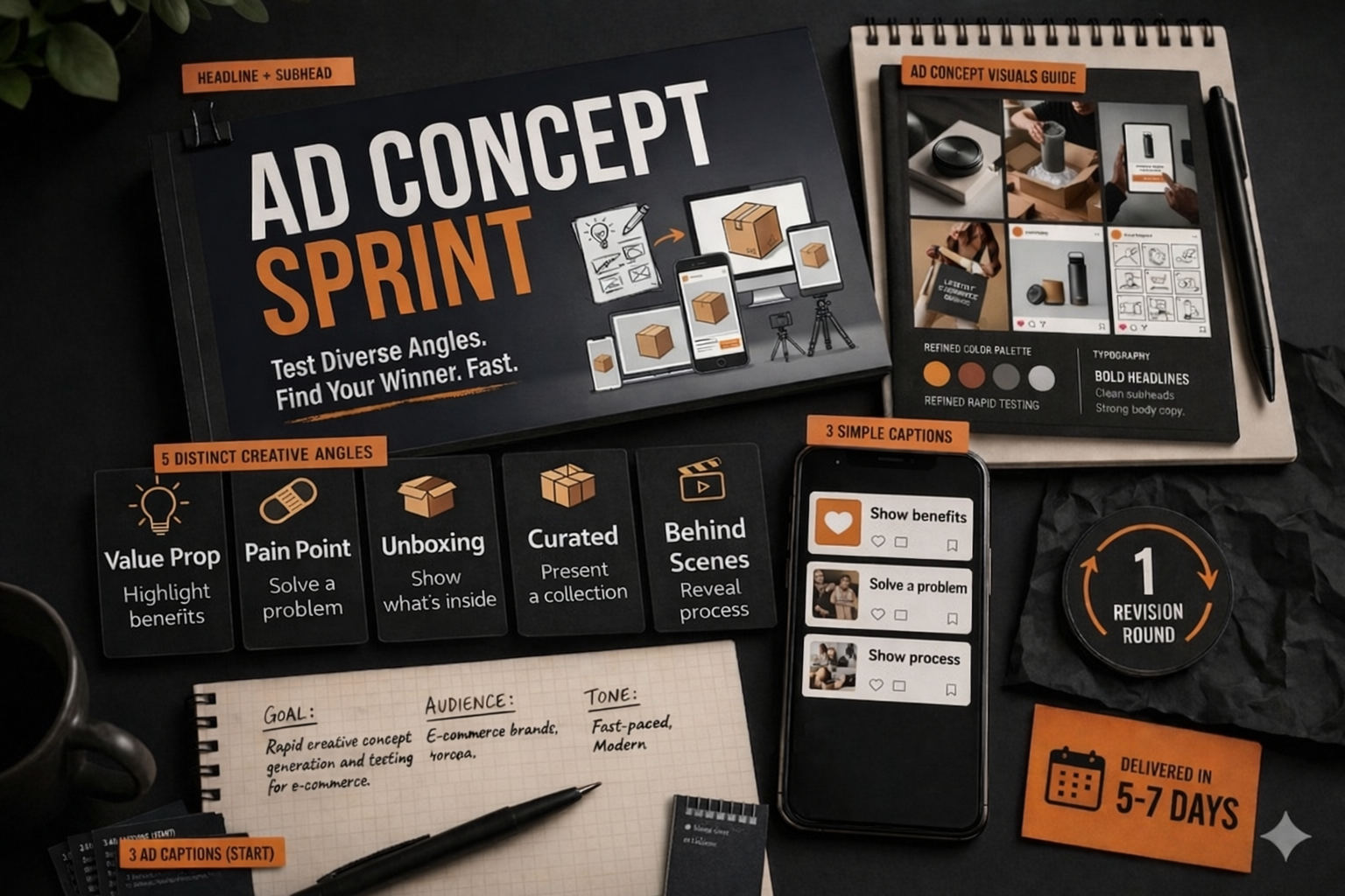 5–8 unique ad concepts, each with a different angle, + video scripts or static image directions + strategic rationale for each concept + A/B testing framework + 1 revision round. Delivered in 5–7 days.