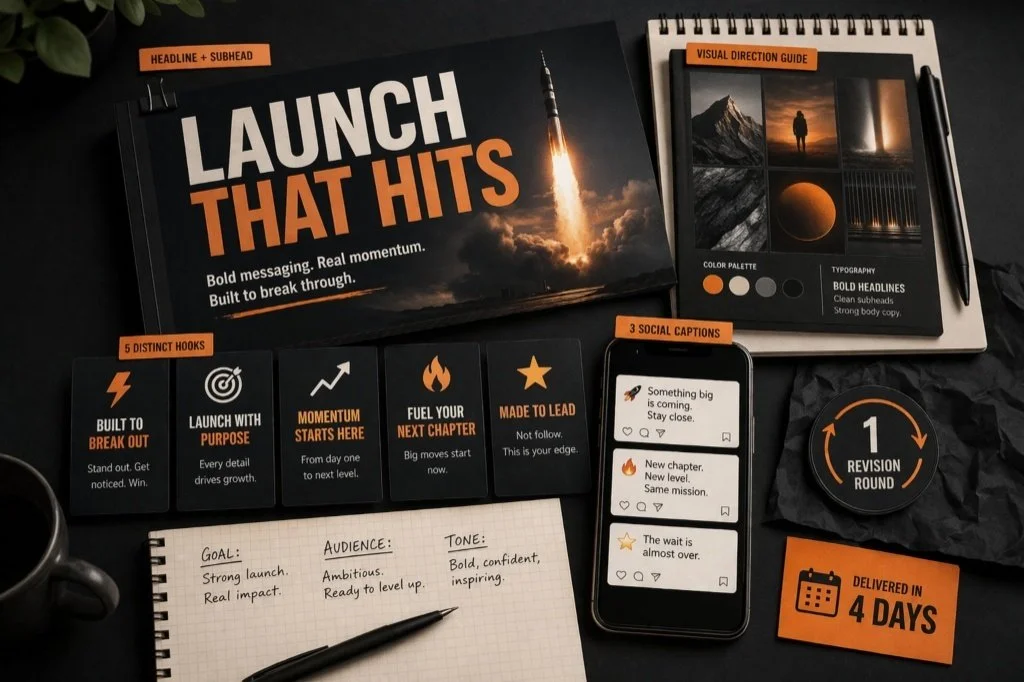 Headline + subhead + 5 distinct hooks + 3 social captions + visual direction guide + 1 revision round. Delivered in 4 days.